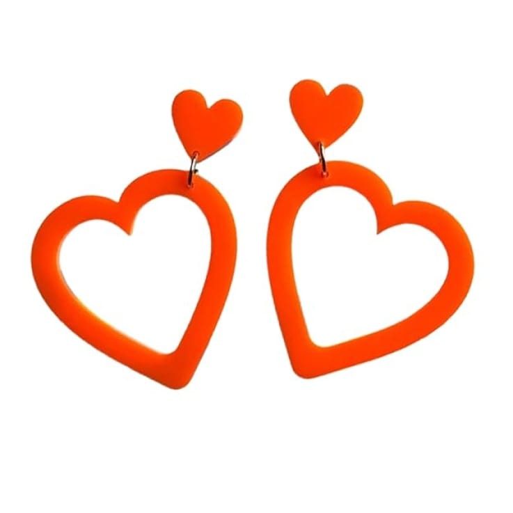 Add a pop of color and fun to your style with these bold acrylic heart-shaped dangle earrings. Designed with a playful open-heart silhouette and a solid heart stud, these earrings are lightweight, comfortable, and perfect for making a statement without weighing you down.