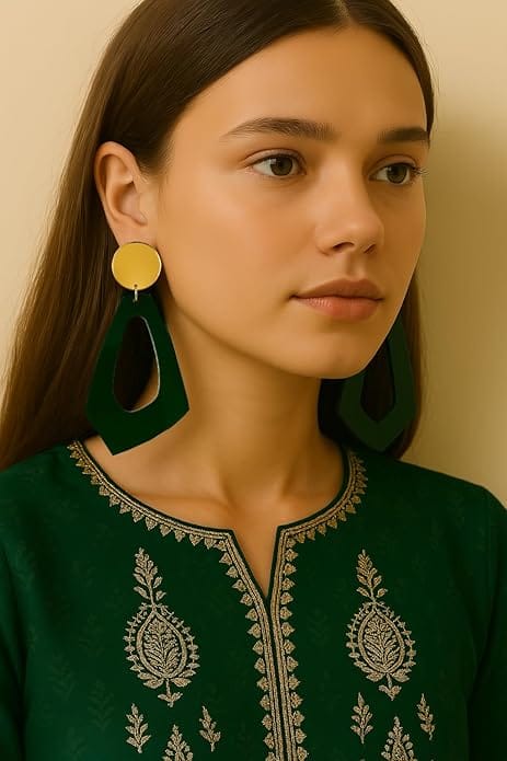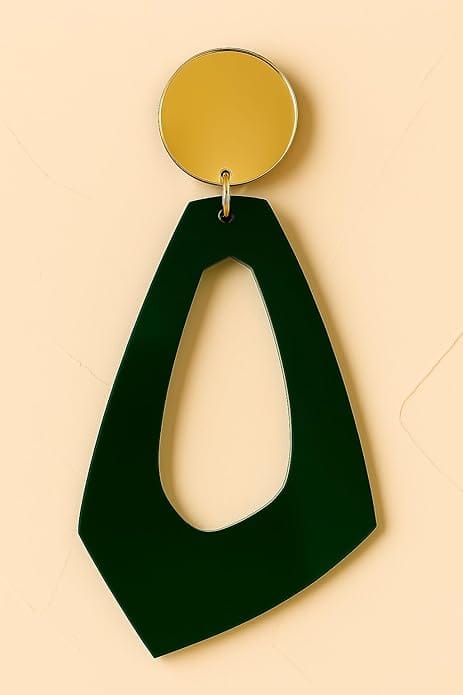 Add a bold, modern edge to your look with these Green & Gold Geometric Acrylic Earrings. Designed with a gold-toned circular stud and an artistic green hollow geometric drop, this pair is perfect for those who love to stand out with unique accessories.