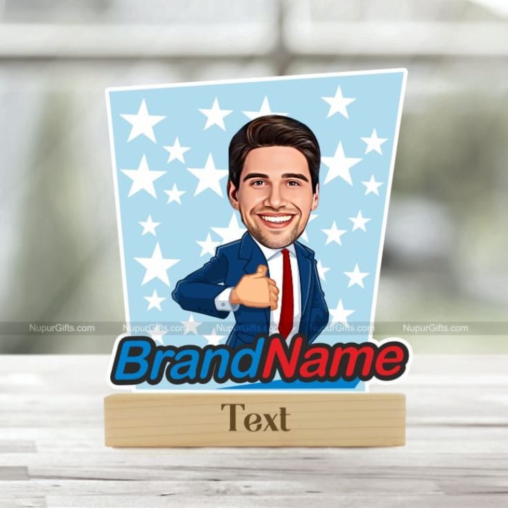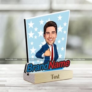 This Personalized Cartoon Caricature Stand features a smart, cheerful boy giving a thumbs-up, customized with your brand name and custom text on a wooden base. It’s the perfect way to highlight your company identity in a fun, eye-catching way.