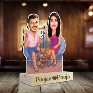 Capture those cozy, relaxing moments with your partner through this Personalized Couple Chilling Caricature Stand. Designed with a fun & romantic vibe, this unique desk stand features your faces caricatured into a relaxing mocktail scene — sitting with drinks in hand, surrounded by fruit platters and a chic ambiance.