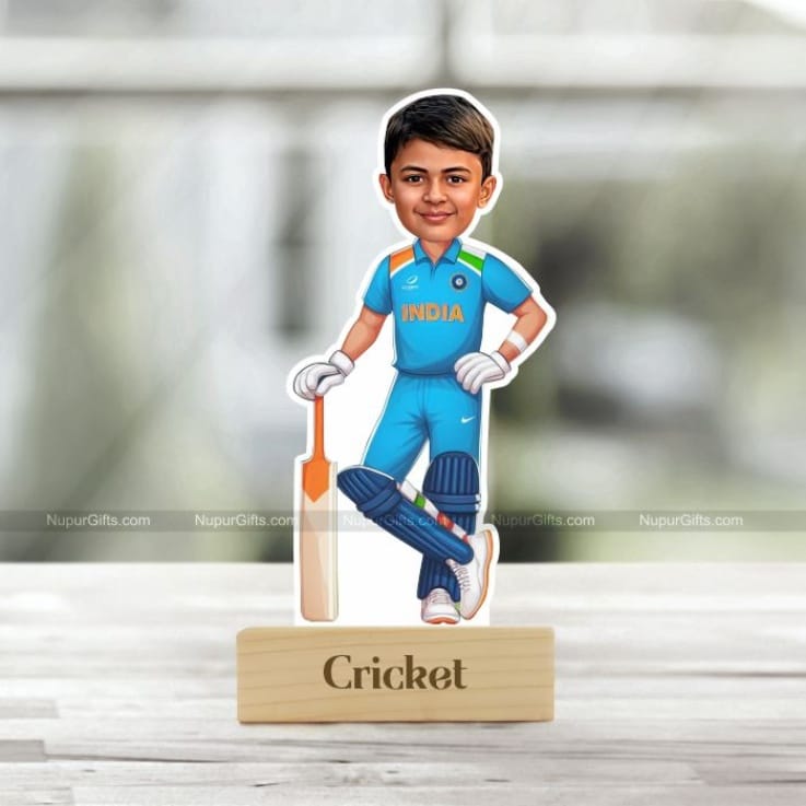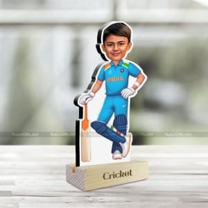 The caricature is printed on high-quality material and mounted on a wooden base with the word “Cricket” engraved, making it a standout piece on any desk, shelf, or display unit.