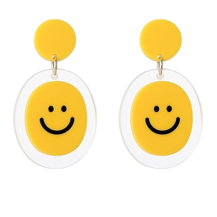 The vibrant yellow smiley face design spreads cheerful vibes, while the transparent acrylic base gives them a modern, stylish look. Lightweight and comfortable, they are easy to wear all day long without causing strain on your ears.